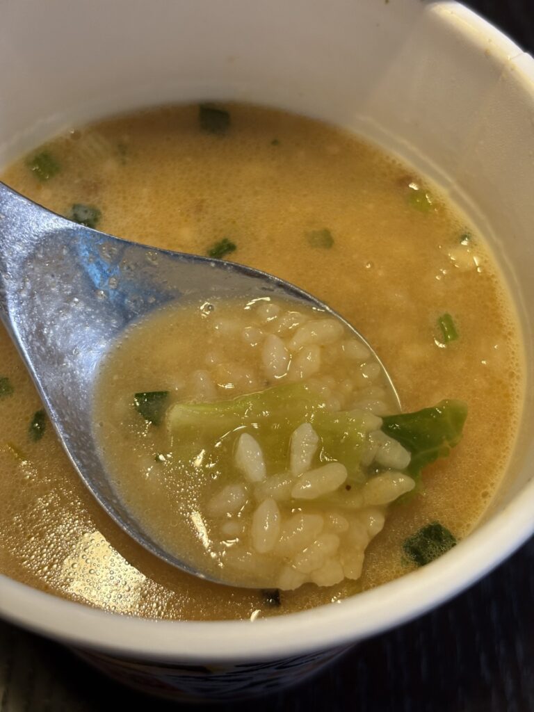 時間が経つにつれてごはん粒がスープを吸ってふっくらしてきて、食べ応えがどんどん増していきます。