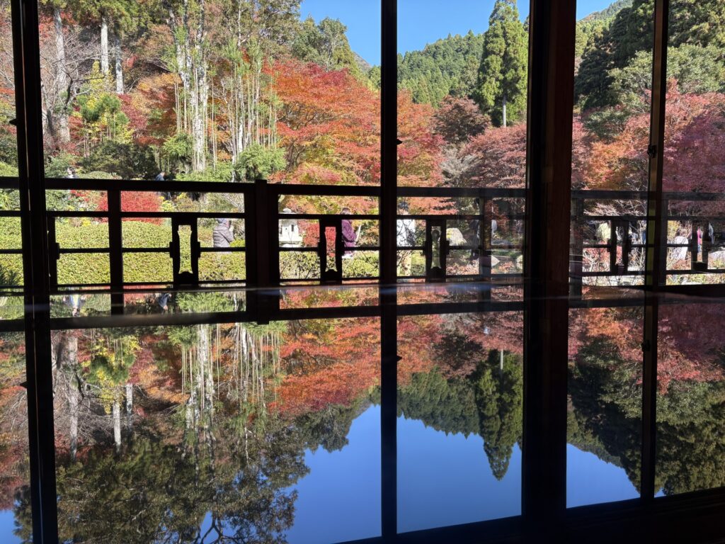 この漆のテーブルに、新緑や紅葉が鏡のように写り込むことで有名で、たしかに目の前に広がる世界は息をのむほど幻想的…!